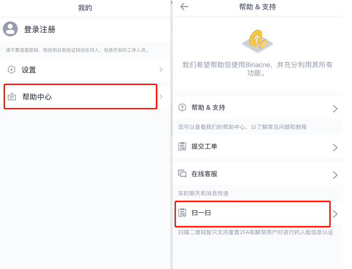 10.打开手机APP的帮助中心,通过扫二维码进行人脸信息认证(确保您的币安APP是最新版本)。